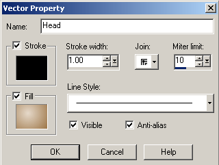 Now we can add the lines for the lip mouth and eyebrows. This is done with the pen tool ( Pencil in PSP7 ) Line thickness 2 - Bezier Curve - Create as Vector "Join Segments" unchecked in PSP9 | |||