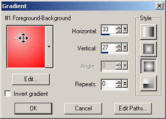 Change the fill to Gradient - Foreground/Background Set the foreground color to pale red and the background to red and set up as shown. Don't forget to drag the center up to the left. ![]() | |