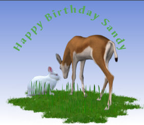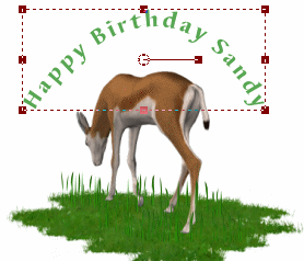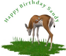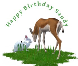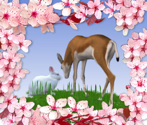 Now let us add another animal. Since our first is bambi why not add thumper. With the mover tool move Bambi over a bit.![]() This activates the animal layer. Now add a layer called "rabbit". It will be inserted immediately above the active layer. Find a nice rabbit tube and add the rabbit. ![]() You will notice that the rabbit is behind the long grass because of the way we placed the layer. If we now decided to move it forward we could drag its layer up to a new higher position in the "Layers" palette. So far we have changed the vector text layer, Changed the animal layer and added a layer to this picture. By now you will have realized that everything in the graphic can be easily changed but before we go let us fill the graphic with color. This whole time our background layer has been white and you may have wondered why it was there at all. The simple reason is that had we wanted to change the "ground" layer it would have been more difficult if it was on white rather than transparent. Let us put a sky behind the graphic. Activate the background layer and fill with a gradient of white to blue. (The sky is always lighter at the horizon than overhead ) ![]() Now activate the text layer and click off its visibility (we don't need the text for what I am going to do ) Add a layer called cherry blossoms and use the "cherry blossom" tube to fill around the image. ![]() You can now save the new image as a jpeg with a different name but don't forget to save it as a PSP image first. Next : Using Vectors |