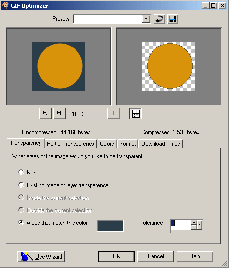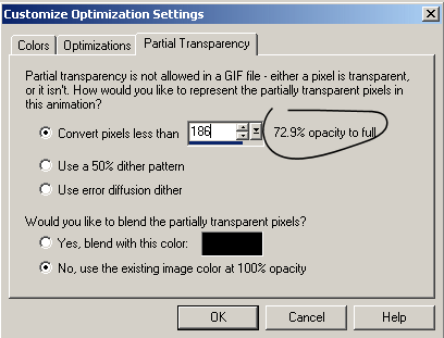 Some hints when saving transparent gifs. First and foremost : If your graphic will not be animated and you know the approximate colour of your page use it as your background colour ( plain, of course, no pattern ) Remember that PSP will put in a colour anyway to be the transparent colour. SAVING OPTIONS Saving with your own background colour is fairly simple so I'll cover that first. The thing to remember is "The lower the tolerance the more added anti-alias colours will be kept and the smoother the result. Raising the tolerance gradually takes away the effect until you have a more jagged edge ![]() Saving with "Existing Transparency" is a little more complicated and is the only way possible in Animation Shop. (AS) I will do PSP first because AS is not nearly so user friendly. Click on the Partial Transparency tab and play around with the controls to get the best result. Zoom in to make sure you know what you are getting. The way you see here is about where I usually end up but different graphics have different requirements so experiment. ![]() Animation Shop If you have trouble getting a good edge in AS go back and save the gif from PSP and make a note of the settings you use. They can be duplicated in AS although the format is slightly different and there is no preview. Once you have your graphic ready to save in AS Go to File > Optimization Wizard - or - Shift Z. Make it easy on yourself and create a new graphic in case you want to try again. ![]() On the next page go to "Customize" ![]() Then click on the "Partial Transparency" tab. The only difference between PSP and AS here is that AS uses 256 colours instead of % in the opacity scale. Luckily the percentage does show so that you can copy what you did in PSP. ![]() Once you have that correct click "OK" and "Next" until the end. Now your animation is ready to save. Return |