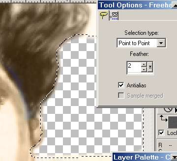 | Using the 'Lasso' tool as shown remove the background of the picture. If you use the 'Point to point' setting you can move it in small moves around the edge of the figure smoothing out fuzzy parts. Take out reasonable size pieces at a time by making a line to the edge of the page and right clicking. once you have the "marching ants" around the piece you want removed press 'Delete' on your keyboard twice. |