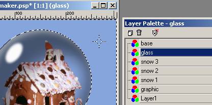 | Go back to PSP and change the layer visibilies to show layer 'snow 2' and not 'snow 1' 'Merge Visible' - 'Copy' - 'Undo' |
