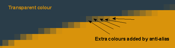 It is all to do with "Anti-alias" which blends the colours on curved edges using partial transparency in order to make them look smooth because the Computer monitor is actually comprised of tiny square blocks of colour. ( pixels ) There is no such thing as partial transparency on a web page. To illustrate this I will draw 2 circles. ![]() ![]() Anti-alias ON Enlarging the edges you can see what anti-alias does. ![]() ![]() When the transparent gif is saved PSP will choose which of the extra colours will be used according to your settings. The more of these colours used the smoother the edge will be. BUT If these colours do not match the background they will produce a halo effect. Reducing the number of these colours used by increasing the "Tolerance" often produces a more jagged effect than the non anti-aliased version. Next "The Jaggies" |