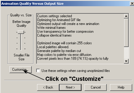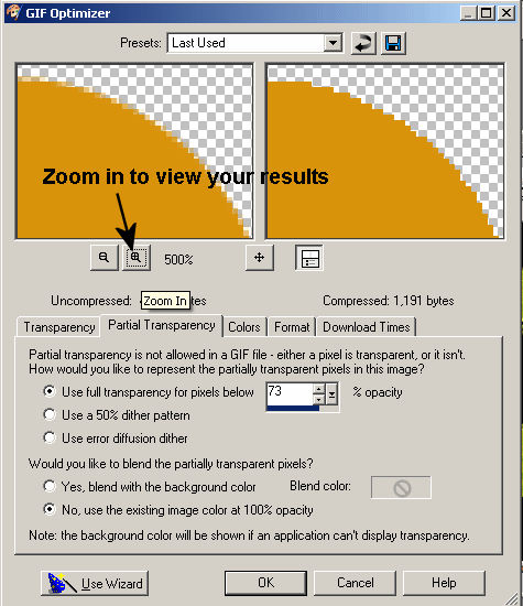 Some hints when saving transparent gifs. First and foremost : If your graphic will not be animated and you know the approximate colour of your page use it as your background colour ( plain, of course, no pattern ) Remember that PSP will put in a colour anyway to be the transparent colour. SAVING OPTIONS Saving with your own background colour is fairly simple so I'll cover that first. The thing to remember is "The lower the tolerance the more added anti-alias colours will be kept and the smoother the result. Raising the tolerance gradually takes away the effect until you have a more jagged edge ![]() Saving with "Existing Transparency" is a little more complicated and is the only way possible in Animation Shop. (AS) I will do PSP first because AS is not nearly so user friendly. Click on the Partial Transparency tab and play around with the controls to get the best result. Zoom in to make sure you know what you are getting. The way you see here is about where I usually end up but different graphics have different requirements so experiment. ![]() Animation Shop If you have trouble getting a good edge in AS go back and save the gif from PSP and make a note of the settings you use. They can be duplicated in AS although the format is slightly different and there is no preview. Once you have your graphic ready to save in AS Go to File > Optimization Wizard - or - Shift Z. Make it easy on yourself and create a new graphic in case you want to try again. ![]() On the next page go to "Customize" ![]() Then click on the "Partial Transparency" tab. The only difference between PSP and AS here is that AS uses 256 colours instead of % in the opacity scale. Luckily the percentage does show so that you can copy what you did in PSP. ![]() Once you have that correct click "OK" and "Next" until the end. Now your animation is ready to save. Return |
