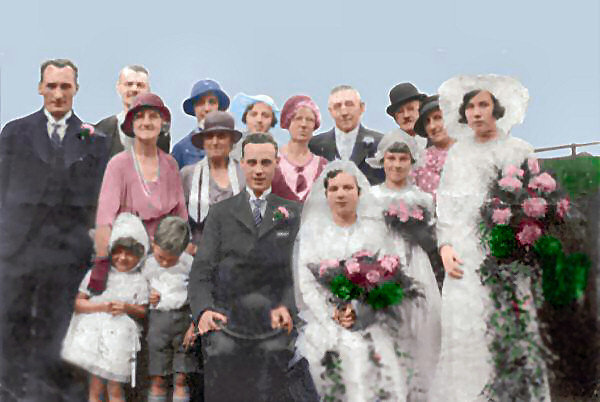 Because of the fold line the bride's nose was going to need some major repainting so I copied the nose from her mother ( standing behind the bride and groom ), adjusted size and shade while still in black and white, and pasted the result onto the bride.