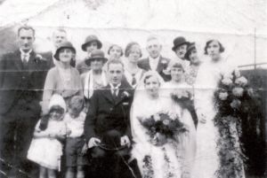 On the original it is hard to tell whether the groom is standing or sitting but on lightening the picture I found that he is sitting with a bowler hat on his knee.